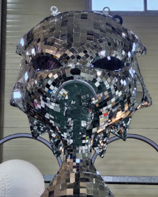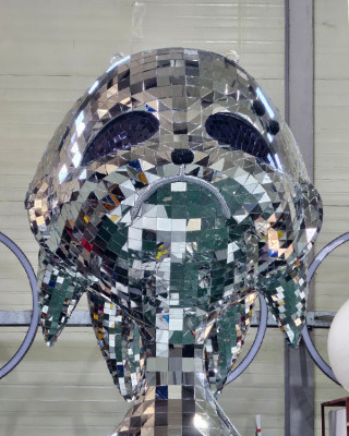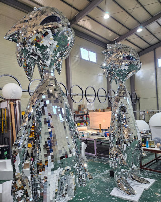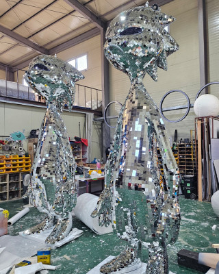 일반적인 거울(미러) 소재를 활용한 마감 방식으로, 평면 판재를 여러 장 이어 붙여 조형물을 구성합니다. 빛과 조명을 반사해 공간을 확장시키거나 화려한 분위기를 강조하는 데 적합합니다.